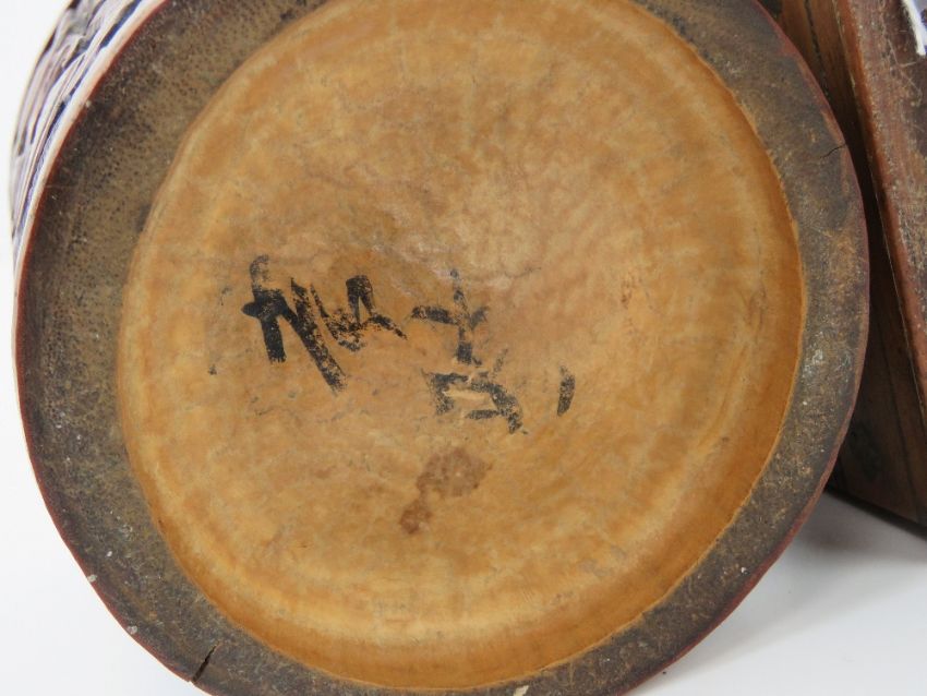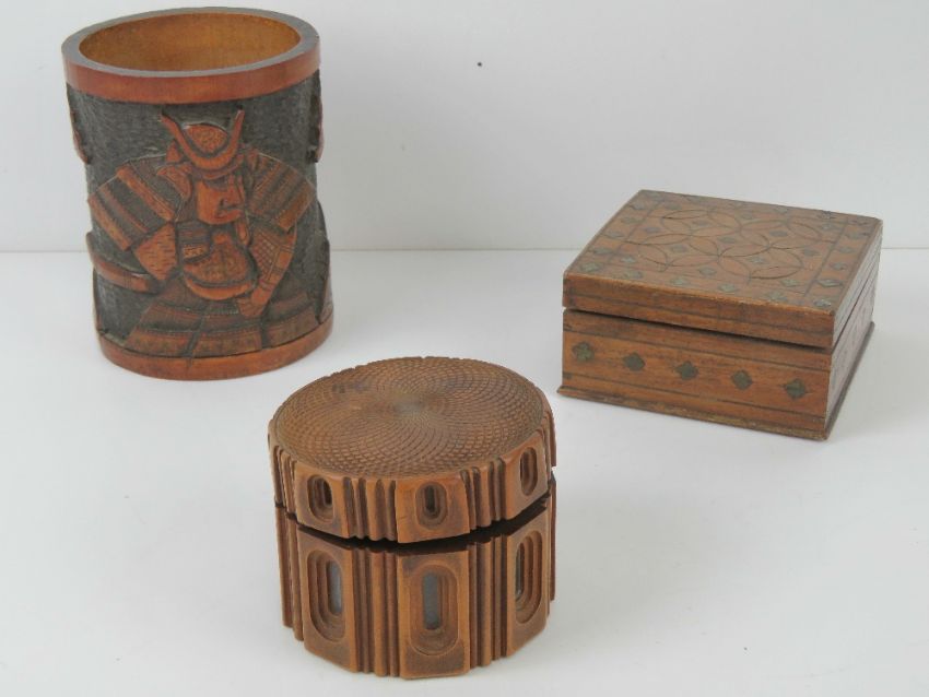 A delightful British India mahogany box inlaid with brass (10 x 10 x 5cm) together with a reeded lidded box with engine turned carved decoration to top (8.5 x 6cm) and a Japanese bamboo brush pot (10 x 12cm). Three items.