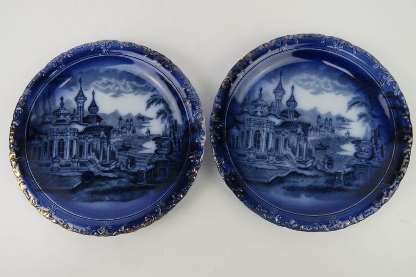 A good pair of blue and white part gilded scenic cabinet plates, un-named, 27cm dia.