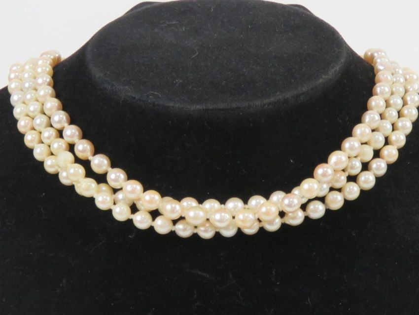 A long string on individually knotted pearls having yellow metal clasp, no apparent hallmarks, 120cm in length.