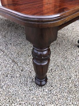 A good wind-out extending mahogany dining table. Three drop-in leaves, one measuring 55cm, two measuring 27cm. All raised over cup and cover legs upon brass castors. 240 x 120 x 74cm.
