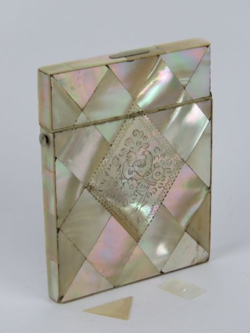 A mother of pearl card case having central diamond shaped panel engraved with birds on flowering branch, a/f.