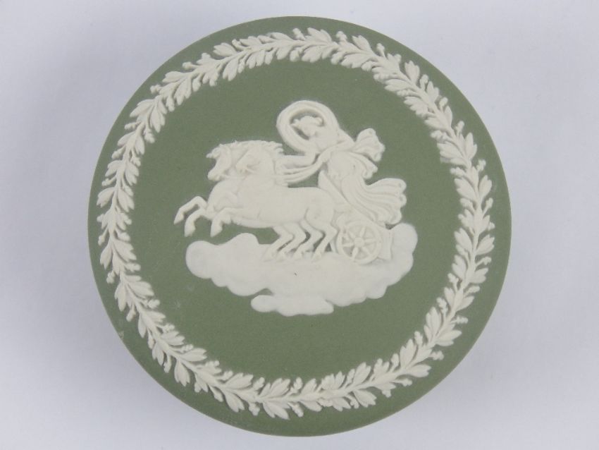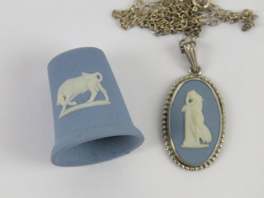 A HM silver and Wedgwood blue Jasperware pendant on silver chain, in original box. Together with a Wedgwood Jasperware thimble in original box and a Wedgwood Jasperware trinket in original box. Three items.