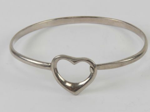 An HM silver bangle having heart design clasp, hallmarked for London, 5.6 x 5.2cm internal dia, 12.2g.