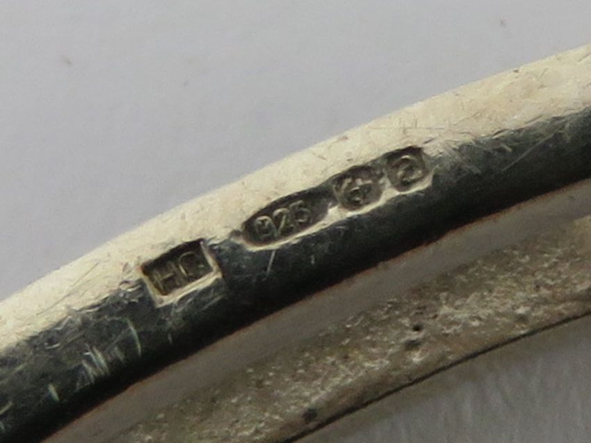 A hallmarked silver solid bangle having alternating square and round but white stones throughout, hallmarked for Birmingham, internal dia 5.4cm, 16.5g.