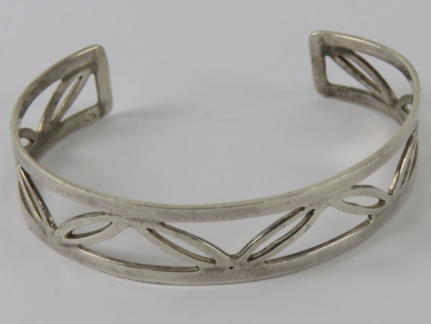 A HM silver bangle having open leaf pattern, 15mm wide, hallmarked 925 and further stamped 925.