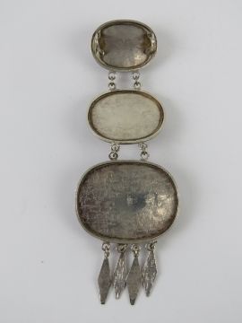 A large and impressive silver and tiger's eye pendant measuring 14.3cm in length having three graduated panels with diamond shaped segments suspended below, each panel set with oval tiger's eye cabachon, stamped Israel 925.