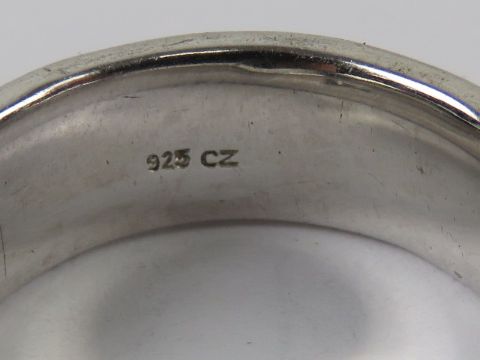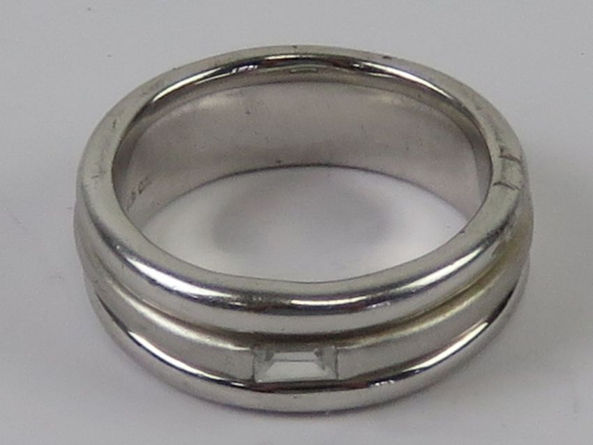 A hallmarked silver ring having baguette cut cz to central brushed finish band having polished finished band to top and bottom, hallmarked 925, size P.