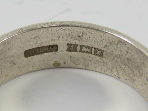 A HM silver ring having continuous engraved pattern to the 6mm wide band, hallmarked Birmingham, size O-P.