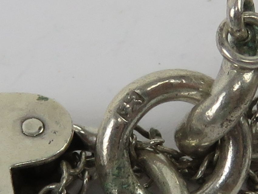 A heavy HM silver charm bracelet having heart padlock clasp, clasp stamped silver, chain having hallmarks throughout, 33.6g.