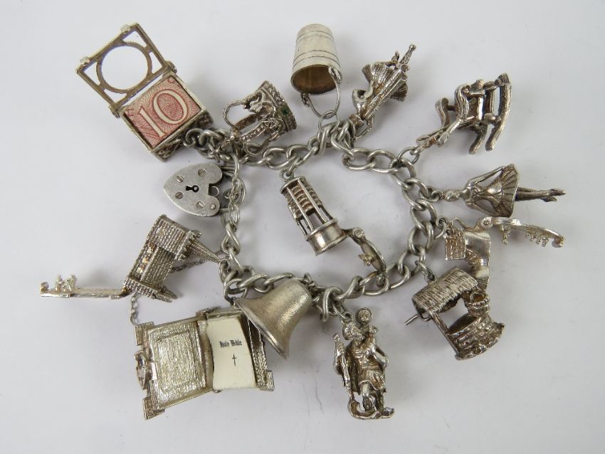 A HM silver charm bracelet with a quantity of large size charms upon including; miners lamp, Irish dancer, ballerina, wishing well, St Christopher figure, bell, church, bible, etc. Hallmarked to clasp and to chain link. 66.9g.