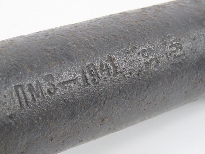 An inert WWII Russian AO-2.5 aerial bomb, dated 1941, with removable fuse and measuring 41cm in length.