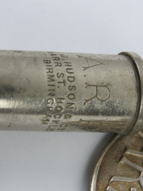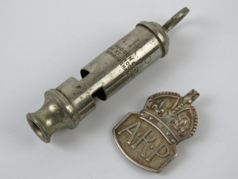 An ARP whistle made by J Hudson & Co Barr St. Hockley Birmingham. Together with a HM silver ARP lapel badge. Two items.