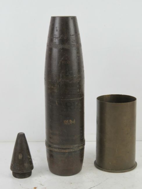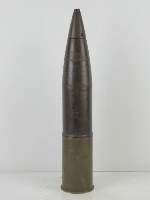 An inert German 10CM shell with head, K18 cannon, dated 1935,with original stencilling on the head, fuse being an AZ23 dated 1943 having makers and German marks upon. Standing 69cm high.