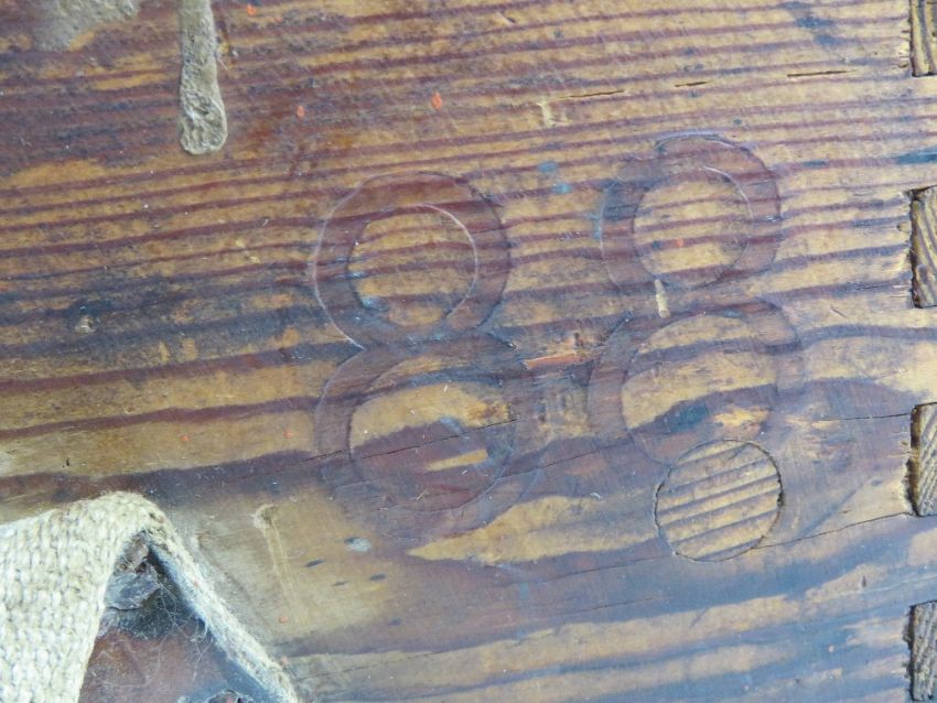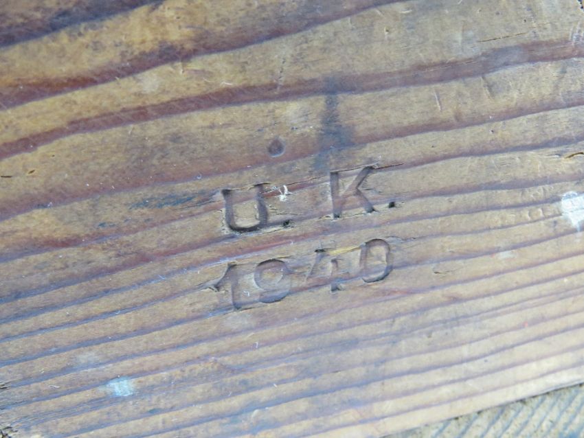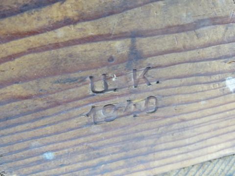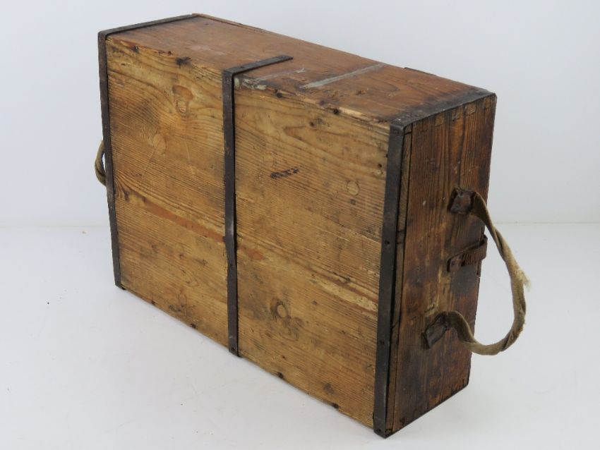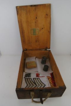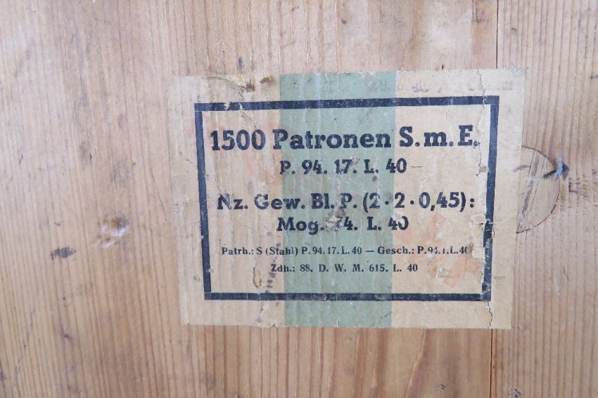 A WWII German ammunition wooden crate with accessories, bearing label within and dated 1940, includes four ranks patches, two WWII German tins, cleaning rod, and a box of cotton wheels with the original cotton.