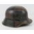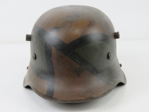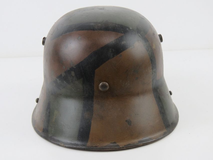A reproduction WWI German M16 helmet with liner having camo paint.