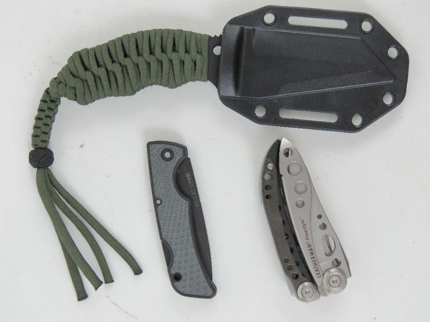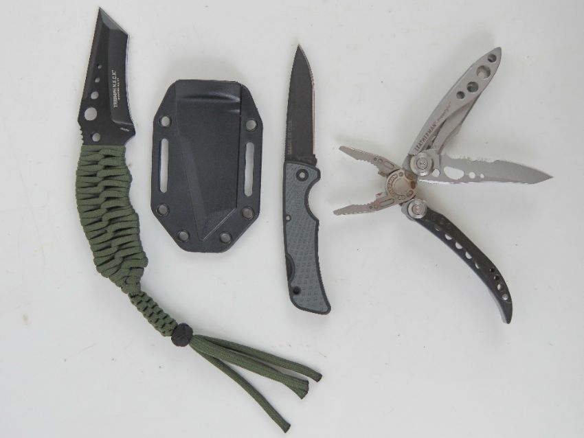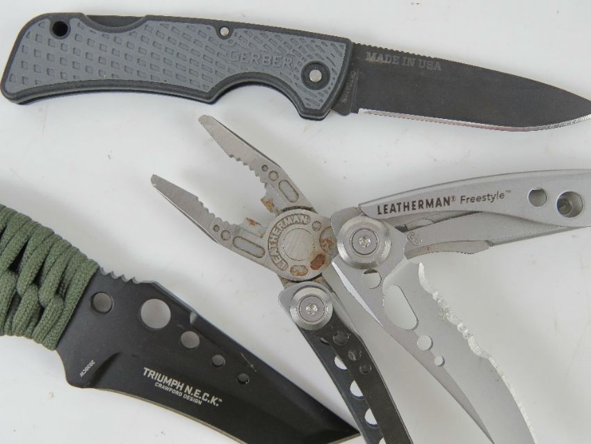 A Leathermans multi tool. Together with an IDEC XXXIII knife and a Triumph N.E.C.K knife in scabbard. Three items.