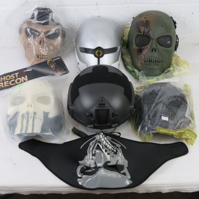 A quantity of assorted Airsoft helmets and masks etc, including a Black Hawk tactical helmet, soft grey helmet, black skull, white punisher, green skull, half txm, ¾ Tan skull etc.