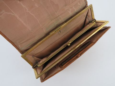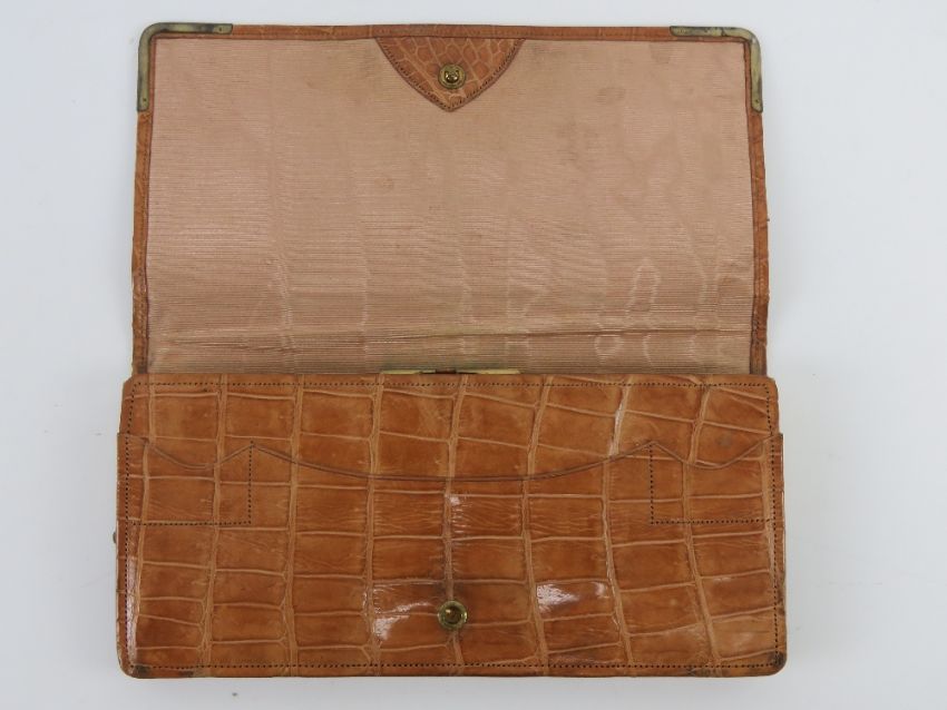 A vintage leather crocodile skin purse or clutch bag having hallmarked silver corner bracing, opening to reveal silk lining with original mirror.
