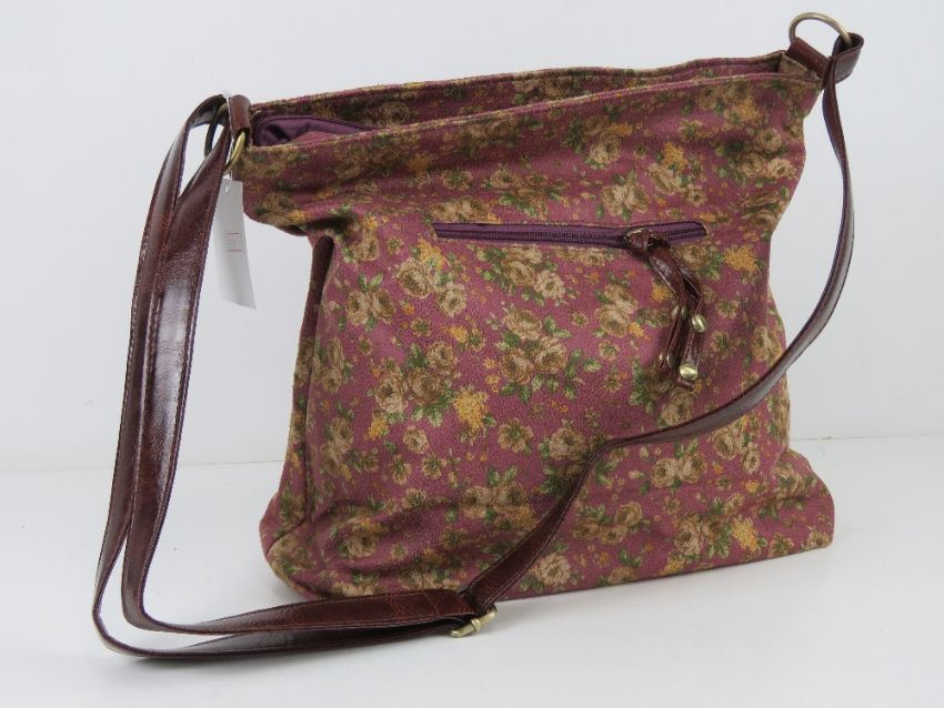An 'as new' fabric tote bag having floral pattern on purple background 34 x 30cm.