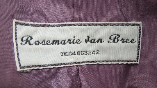 Designed and made by Rosemarie van Bree; cropped trousers and jacket two piece suit in purple tweed, approx measurements - jacket 35" chest, 25.5 length to back, 15.5" sleeve. Trousers 29" waist, 23" inside leg length.