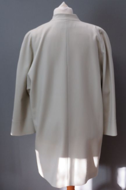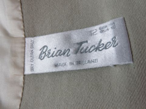 Brian Tucker; Pure new wool ladies 3/4 jacket in pale green, dry clean only label within, UK size 12. Approx measurements; 44" chest, 37 1/2" length at back inc mandarin collar, 15 1/2" sleeve length underarm.