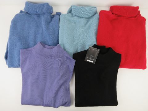 A quantity of 100% Merino wool jumpers, all size XS, approx size 8-10UK, two bearing labels for Cotswold Colelctions (one having original tags upon) and two bearing labels for WoolOvers, also a 70% Merino wool 30% cashmere WoolOvers XS jumper. Five items.