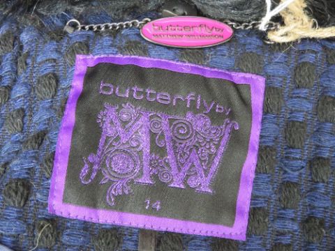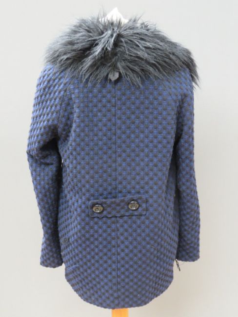 A ladies jacket in navy and black with faux fur collar, 10% wool, size 14.