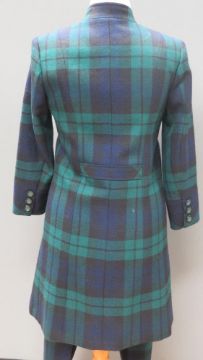 Designed and made by Rosemarie van Bree; two piece suit comprising cropped trousers and 3/4 length jacket in green and navy tartan, approx measurements - jacket 36" chest, 38.5" length to back, 15.5" sleeve, trousers 29" waist, 24" inside leg length.