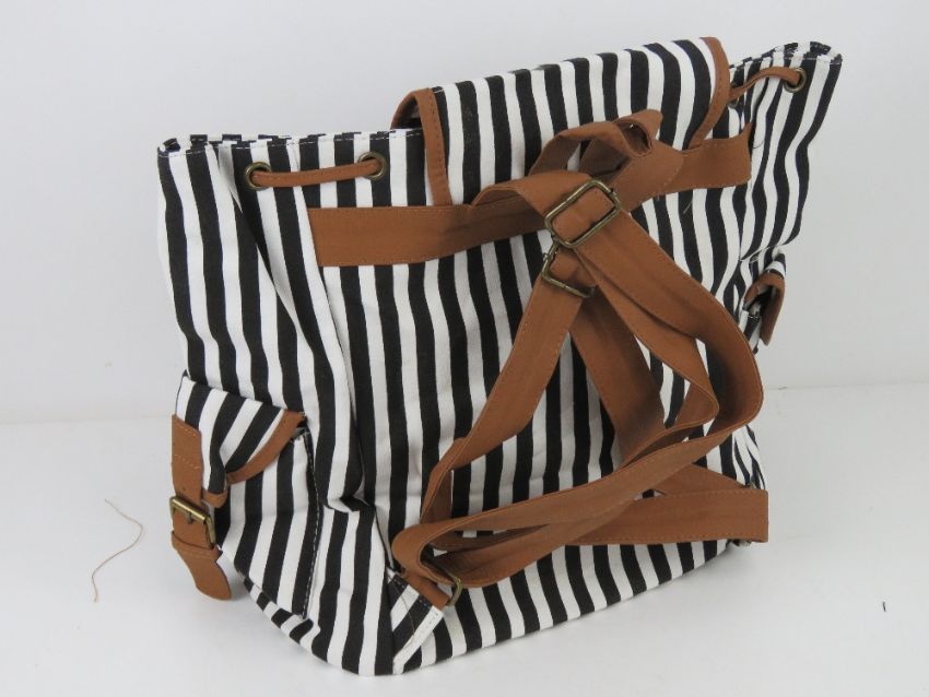 An 'as new' ruck sack in black and white striped pattern approx 33 x 34cm.