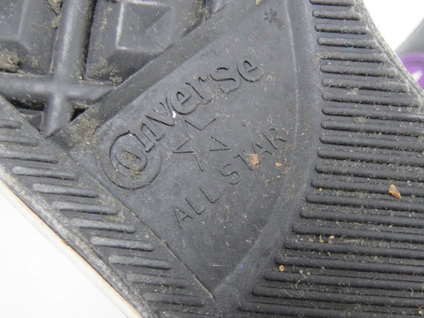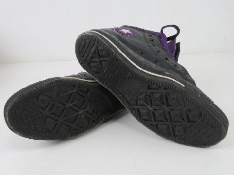 A pair of black leather Converse All Star trainers with two pairs of laces in black and purple, UK size 6.