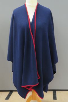 A 100% lambswool John Waverley of Hawick shawl in navy blue and red, approx measurements at back, 34". Mark noted to hem at back, in need of dry cleaning.