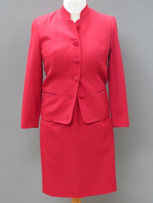 Designed and made by Rosemarie van Bree; Two-piece skirt suit in red, jacket measuring approx 36" chest, 23" length to back, 14.5" sleeve. Skirt approx 30" waist, 22.5" length.