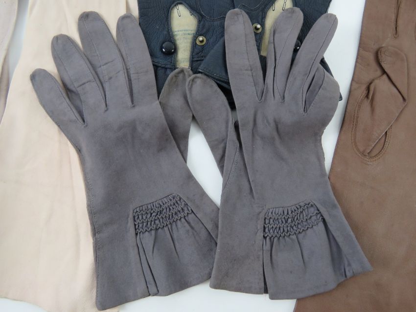 Eleven pairs of ladies leather and suede gloves in grey, burgundy, navy and blush. Also a pair of elasticated silken gloves. Twelve items.
