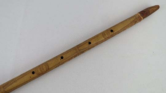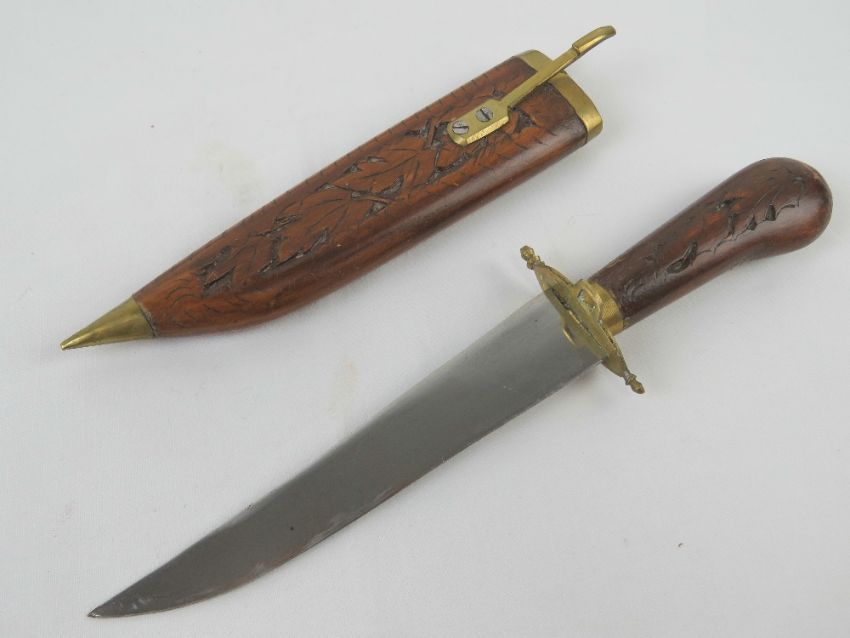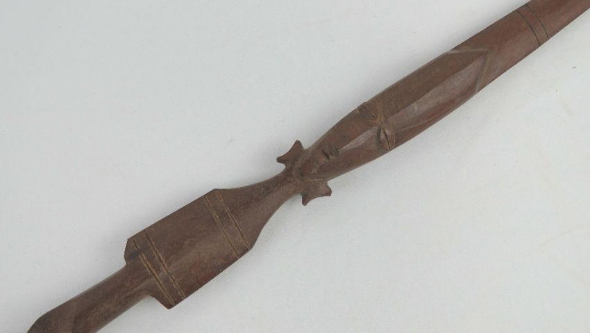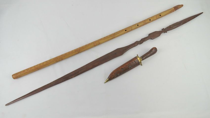 A decorative dagger in carved wood and brass sheath, together with a decorative carved wooden 'spear' and a musical instrument. Three items.