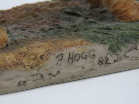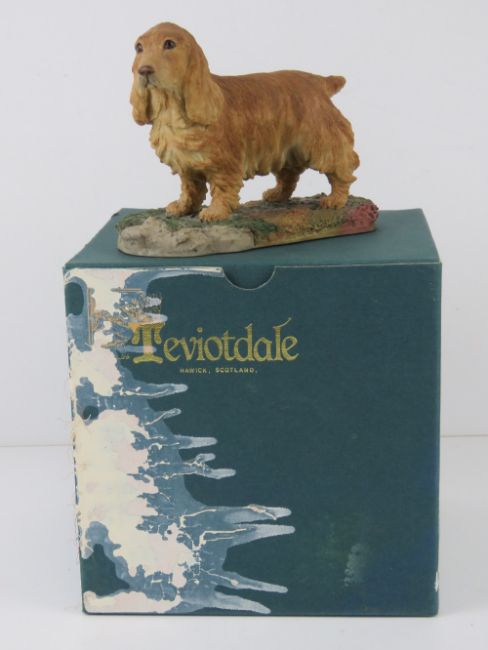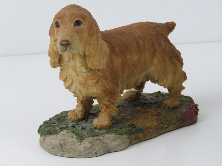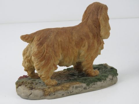 A figurine of a Golden Cocker Spaniel bearing label for Arista Designs Hawick Scotland and signed P. Hogg '82, 15cm wide, with box.