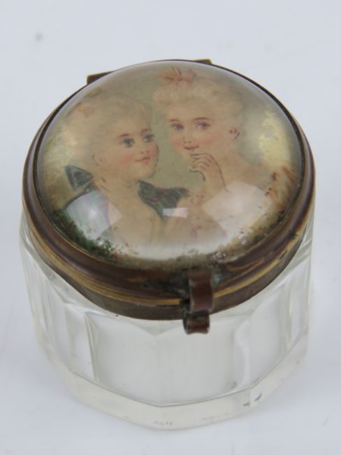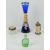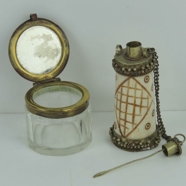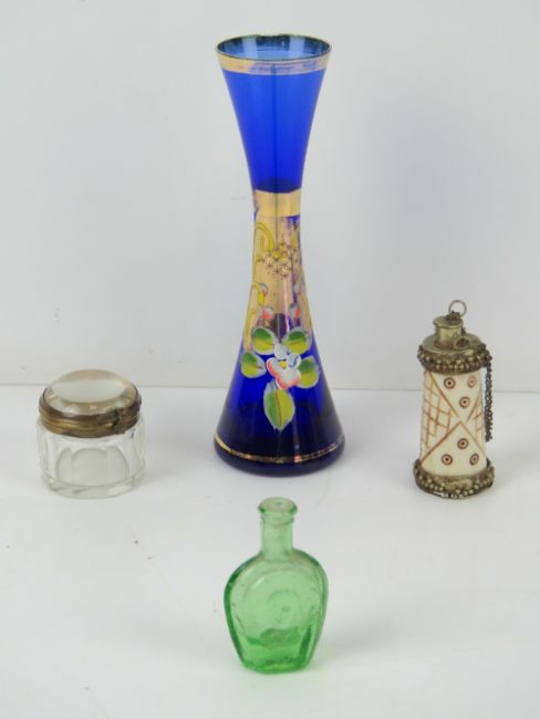 A Venetian hand painted glass bud vase, 15cm high, together with a carved bone scent bottle, 7cm high, a miniature green glass bottle having portrait and indistinct writing to front and a rouge pot. Four items.