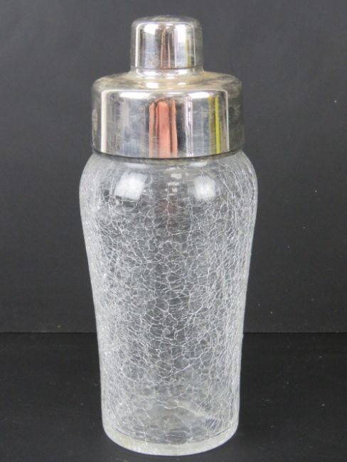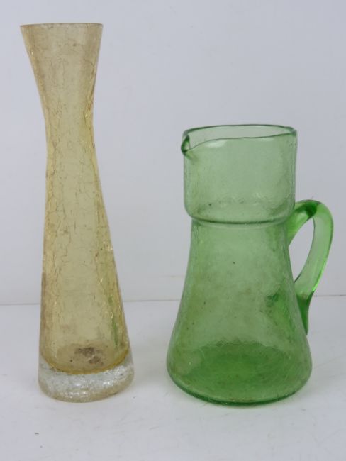 A crackle glass cocktail shaker (21cm high) together with three other crackle glass items being jug and two vases. Four items.