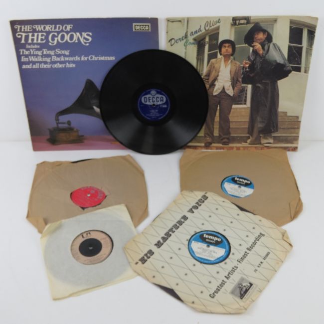 LP records; Derek and Clive Come Again Feat W Moore and Peter Cook, a/f. Together with The World of the Goons, The Goons I Love You, CHris Barber's Jazz Band x 2, My September Love (33 1/3rpm 12"). Together with a 45rpm Laurel and Hardy with the Avalon Boys The Trail of the Lonesome Pine.
