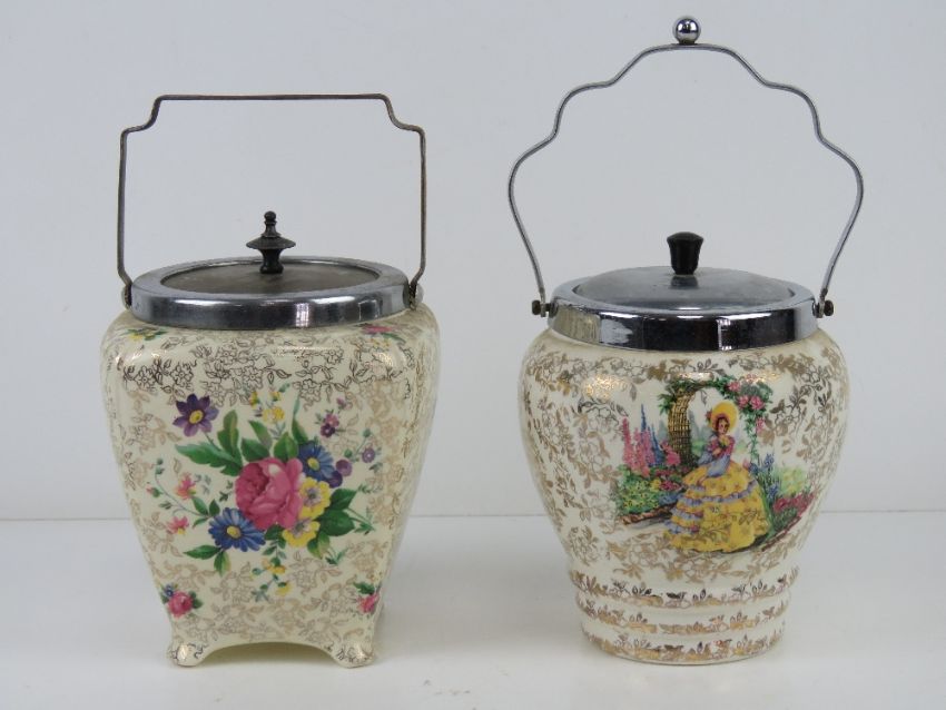 Two ceramic and nickel plated transfer printed wafer / biscuit barrels c1950s, floral design.