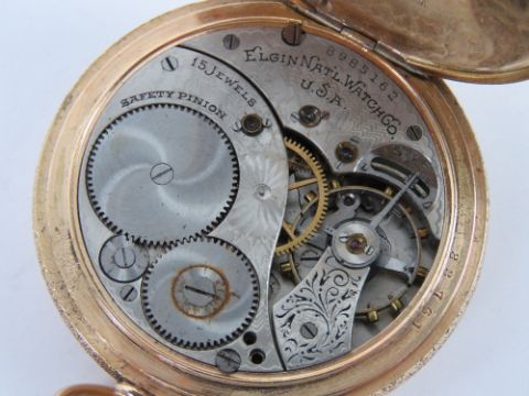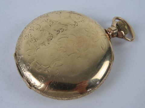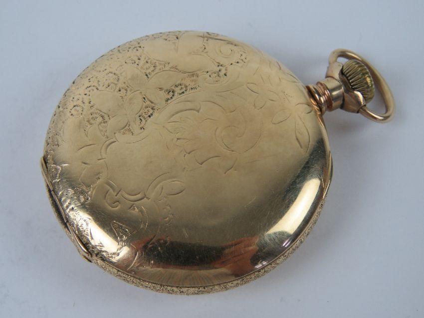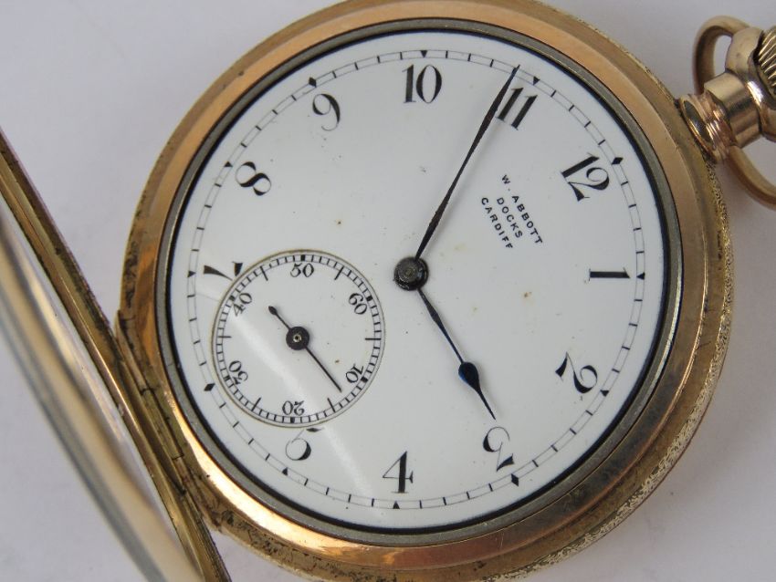An open faced pocket watch marked W.Abbott Docs Cardiff, having white enamel dial with subsidiary seconds dial and blue steel hands, gold plated case having floral engraving throughout, top wind, 46mm dia, total weight 72g.