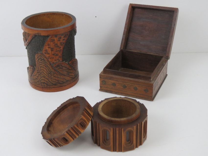 A delightful British India mahogany box inlaid with brass (10 x 10 x 5cm) together with a reeded lidded box with engine turned carved decoration to top (8.5 x 6cm) and a Japanese bamboo brush pot (10 x 12cm). Three items.