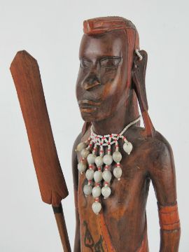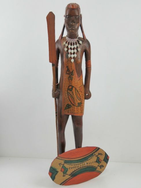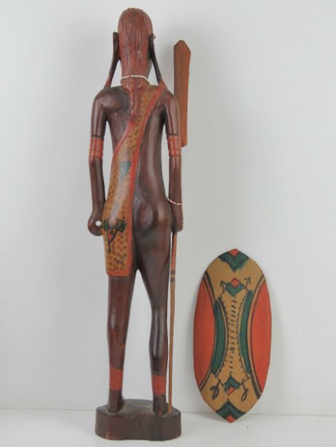 A carved wooden figurine of a tribesman with spear and shield standing 59cm high.