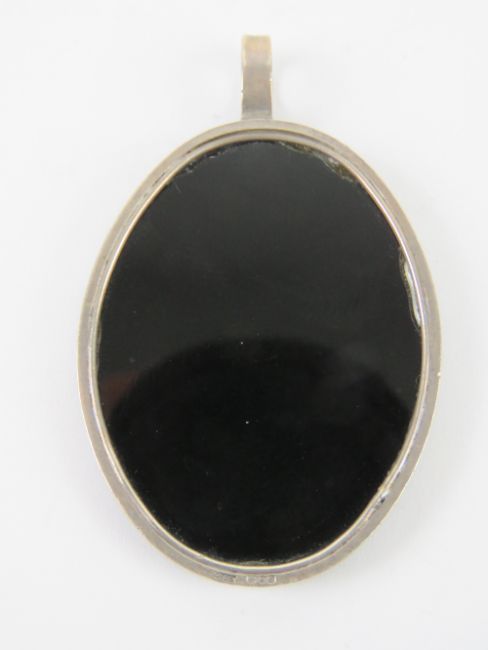 A large carved onyx pendant having warrior upon in HM silver frame, measuring 5.3cm inc bale, hallmarked for London.