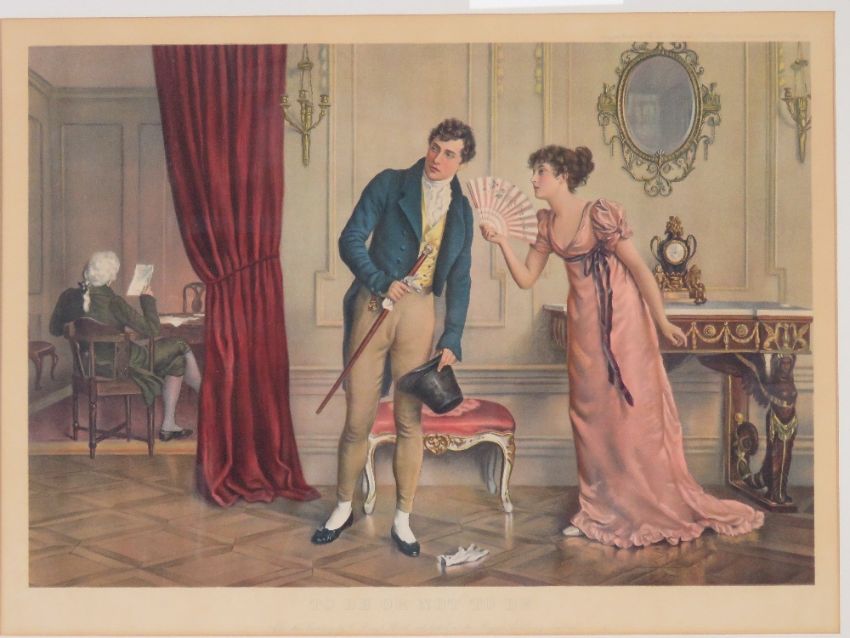 A good pair of coloured prints entitled 'To be or not to be' and 'Two screens to her bow' from paintings by C Haigh Wood, as exhibited at the Royal Acadamy. 42 x 57cm, framed and mounted.