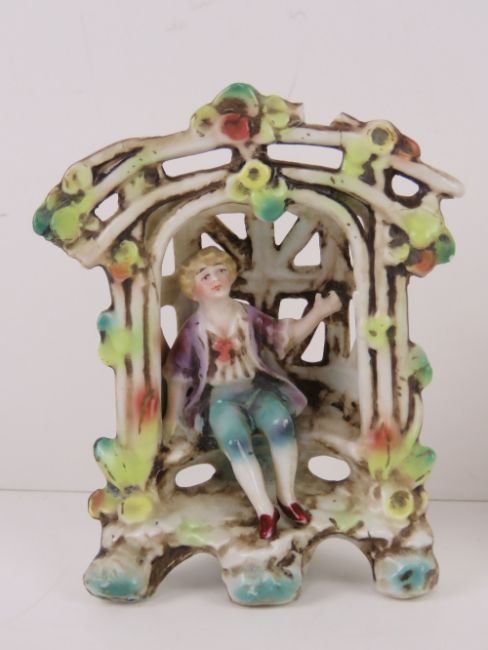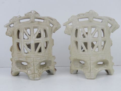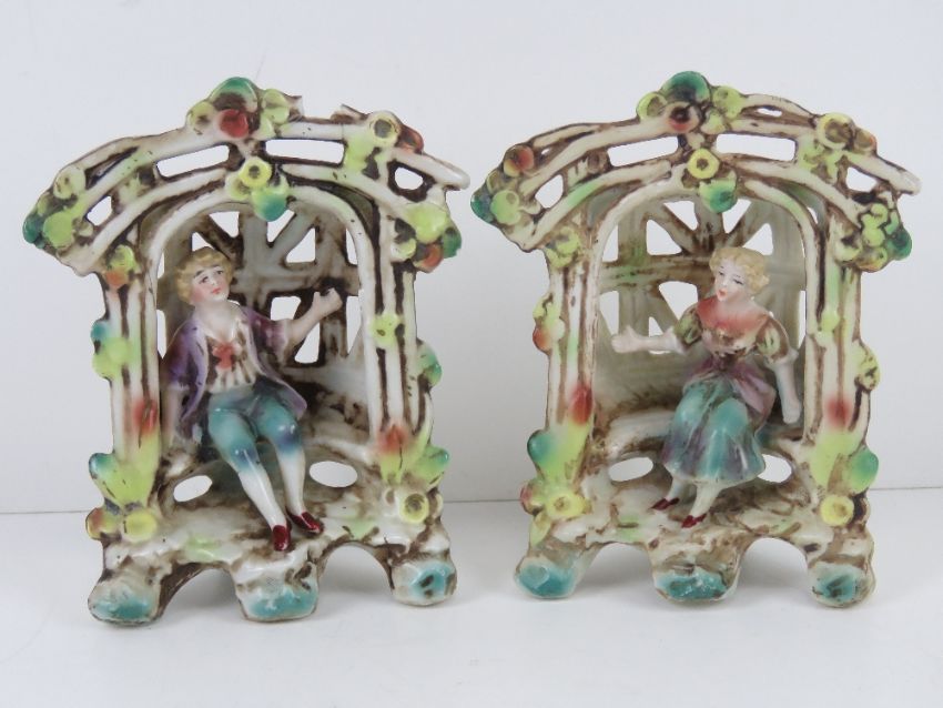 A pair of lattice ware ceramic figural garden floral encrusted seats with boy and girl upon, each 12cm high.