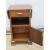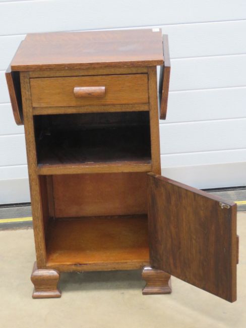 An unusual 1940s oak drop leaf bedside cabinet having single drawer with door under, 84cm (extended) x 39 x 76cm. Together with an oval oak side table with twin shelves under, 56 x 40 x 69cm. Two items.