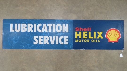 A vintage c1980s Shell Helix Motor Oils 'Lubrication Service' sign made on fibreboard and measuring 153 x 38cm.