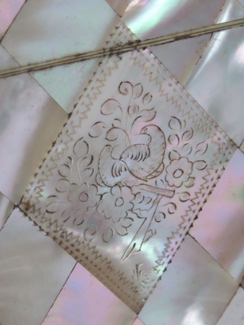 A mother of pearl card case having central diamond shaped panel engraved with birds on flowering branch, a/f.