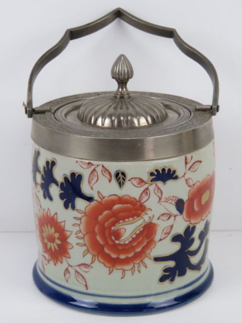 A good Ironstone Imari pattern wafer / biscuit barrel with nickel plated lid and handle.