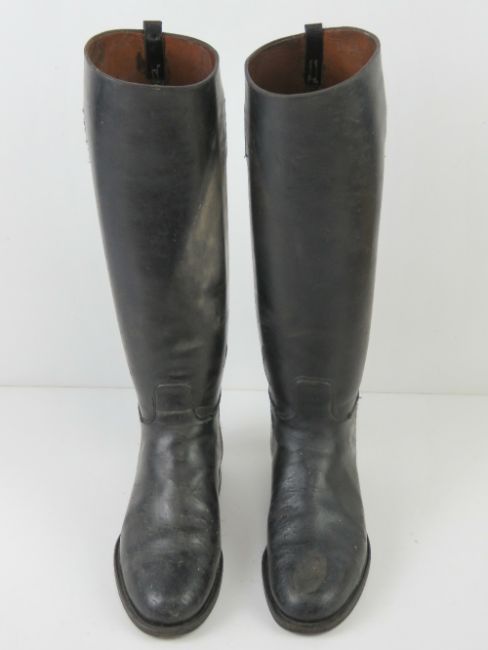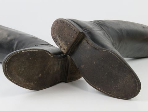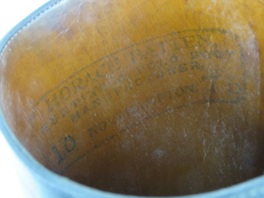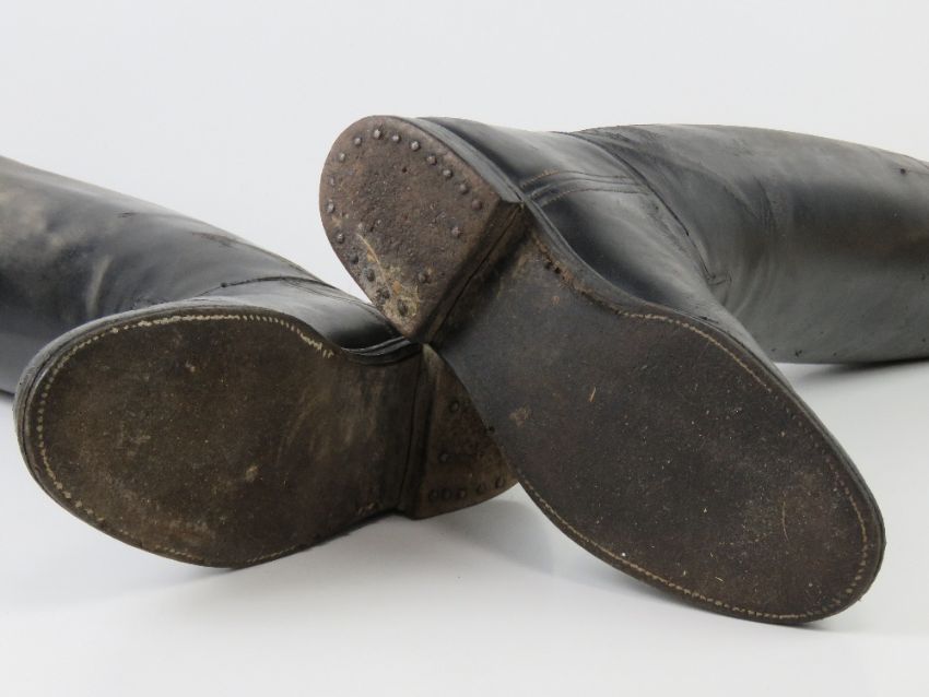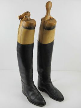 A pair of black leather riding boots, having interior finger pulls, Horace Batten three sectional trees (one a/f), 11" heel to toe.